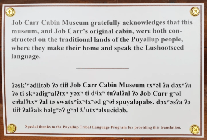 We gratefully acknowledge that this museum, and Job Carr's original cabin, were both constructed on the traditional lands of the Puyallup people, where they make their home and speak the Lushootseed language.